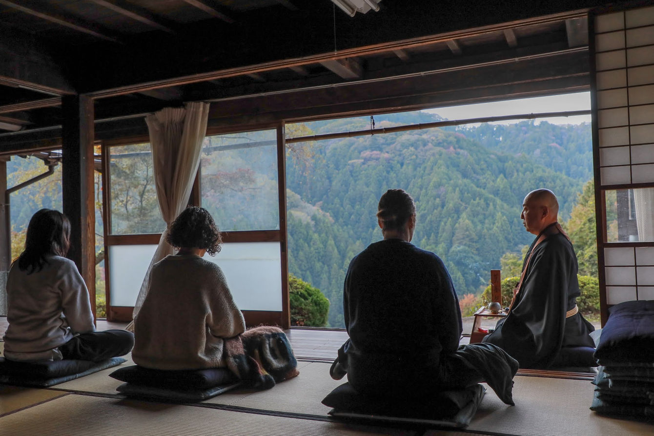 The day begins with zazen, a meditative practice led by the head monk of a local temple, offering time for self-reflection within the quiet mountain landscape.